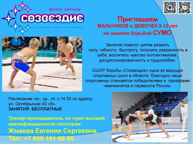 ОбъявленияОбъявляется набор групп на отделение борьбыОбъявляется набор мальчиков и девочек на отделение борьбы по следющим видам спорта : Дзюдо - с 7 лет, Сумо - с 10 лет, Самбо - с 7 лет, Спортивная борьба с 7 лет. Запись проводится по телефону 39-15-26 18-08-2023НовостиПоздравляем с присвоением спортивных разрядов! 26-02-2026![]() Федеральный экспериментальный (инновационный) проект «СТАНЬ ЧЕМПИОНОМ» 25-02-2026![]() Неделя поддержания и укрепления иммунитета 24-02-2026![]() |